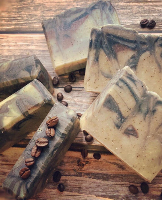 Made with pure coffee grounds to give a deep aroma and a gentle exfoliating texture. Scented with sweet & spicy Ginger, Orange & Cinnamon essential oils, and coloured only with the coffee grounds, activated Charcoal & Cinnamon powder.
