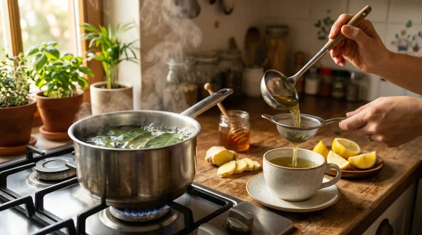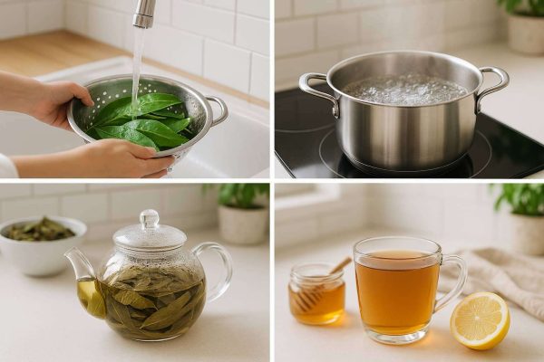 - Boil 250 mL of water to 194°F (90°C). Add leaves and steep for 7–10 minutes.