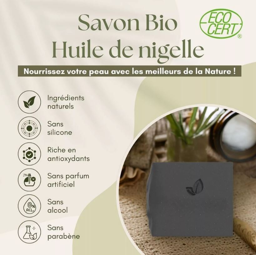 Organic Black Seed Oil Soap offers exceptional benefits for the skin thanks to its anti-inflammatory, antioxidant and moisturizing properties, helping to soothe irritation and improve the complexion's radiance. Ideal for all skin types, this natural soap also helps regulate sebum production and fight against imperfections, making it an essential choice for a healthy and effective skincare routine.