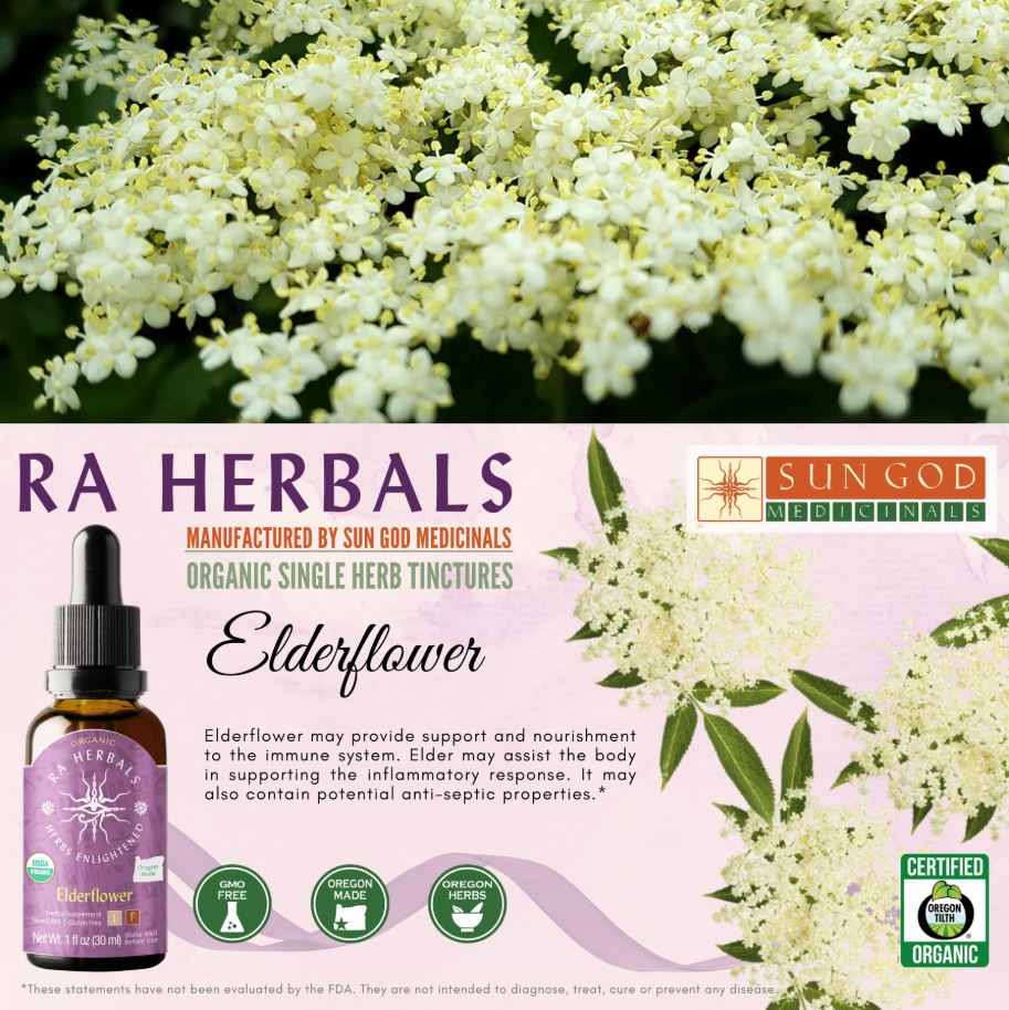 A certified organic single herb tincture of Elderflower (Sambucus Nigra)
