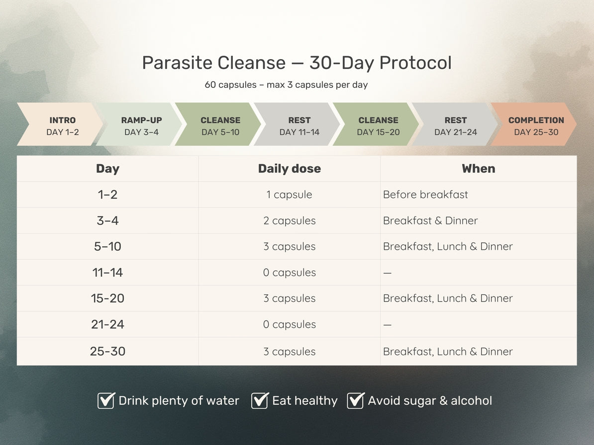 A common approach is to follow the recommended daily dose for 30 days, then take a break. If you are sensitive or new to herbal formulas, consider using Parasite Cleanse in 7–10 day cycles, followed by a 7-day break. You can repeat these cycles, or follow our Cleansing Schedule for a guided plan.